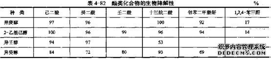 合成飽和酯的生物降解性與其化學結構有很大關系。S.J.Kandles對不同結構的酯類化合物的生物降解性進行了研究,結果見表4-82。可以看出,由同種酸和不同鏈長的異構醇反應生成的酯類化合物,生物降解性隨支鏈醇相對分子質量的增加而降低。由不同二元酸和同種醇反應生成的酯,其生物降解性不隨酸相對分子質量的增加而變化。在酯類化合物中,引入芳環會減弱生物降解性。總之,線性、非芳環和無支鏈的短鏈分子的生物降解性通常較好。由此看來,用作環境友好潤滑油基礎油的合成酯一般是雙酯、多元醇酯、復合酯和混合酯。