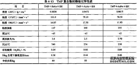 雙酯是由二元羧酸,如己二酸、壬二酸、癸二酸等與2-乙基己醇、異辛醇、壬醇、異癸醇等一元醇直接酯化而成;而多元醇酯是由新戊基多元醇與二元羧酸及一元醇經過二步酯化而生成。用來合成多元醇酯的新戊基多元醇有新戊基二元醇、三羥甲基丙烷(TMP)、季戊四醇,二元羧酸有癸二酸(SbAc)、壬二酸(AzAc)和已二酸(AdAc),一元醇主要有2-乙基己醇(EH)、異辛醇、壬醇、異癸醇。TMP復合酯的理化性質見表4-83。從表4-83可以看出,TMP復合酯具有較高的粘度指數,較低的傾點,較低的有機酸度,其閑點與粘度指數隨著二元酸碳鏈長度的增加而增加。